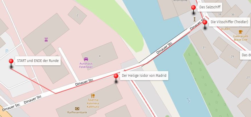 Starten Sie am Parkplatz beim ehemaligen Nettogebäude in der Dinauer Straße 6 und wenden Sie sich dem frisch renovierten Haus in der Dinauer Straße 1 zu. Heute befinden sich darin die Raiffeisenbank sowie das griechische Lokal Kalimera.