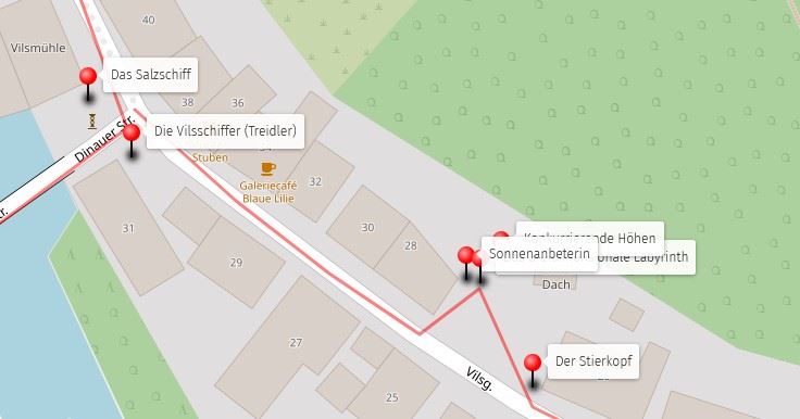 Bald fällt rechts das reich verzierte rote Haus mit der Nummer 25 ins Auge. Auf seinem Giebel sehen Sie eine Glocke die als „Kirchenglocken-Booster“ fungierte. Da der mächtige Felsen den Schall der Kirchenglocken hierher abschirmt, war es notwendig, diese ebenfalls zu Läuten, damit das Signal hier in der westlichen Vilsgasse ankam. Früher, als noch nicht jeder eine Uhr besaß, war dies von großer Bedeutung, denn das Glockengeläut strukturierte den Tagesablauf.